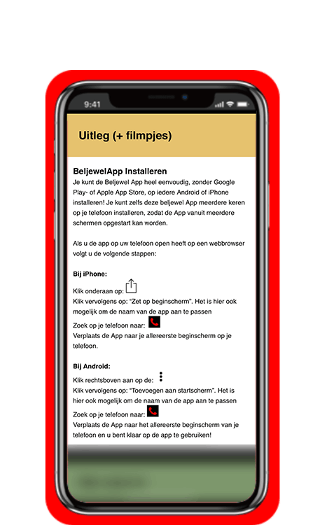 De Beljewel App is volledig werkend, de video's en foto's hieronder komen dan ook vanuit een echte applicatie, klik hier of in de menubalk "App installeren", voor meer info.