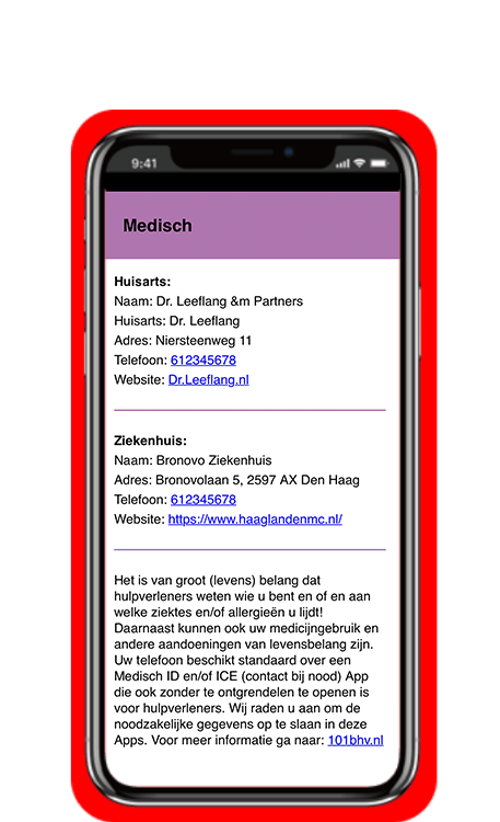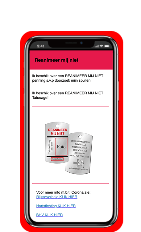 Ook belangrijke info zoals niet reanimeren, huisarts en ziekenhuis, kunt u mij thuis brengen zijn in de app verwerkt.