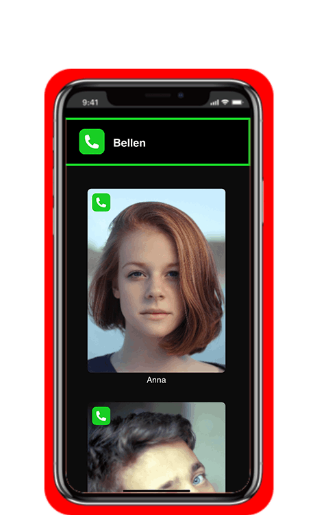 Om het nog simpeler te maken gaat, na het klikken op het contactpersoon, het beeld voor een aantal seconden op zwart*, waardoor de ogen naar onderen worden "getrokken" zodat alleen nog maar de "belknop" in beeld komt.