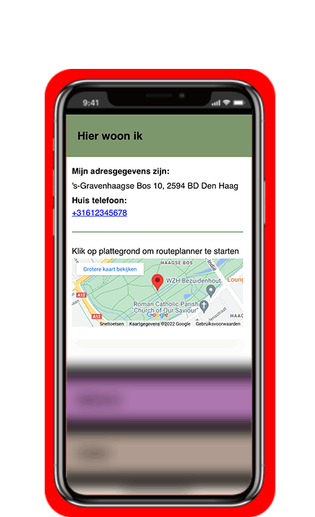 Klik op de plattegrond en Google routeplanner start op, dit kan de gebruiker van de telefoon helpen om weer thuis te komen, of een bereidwillig iemand zou deze persoon naar huis kunnen brengen.
